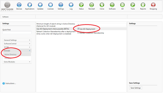 To set up AD-Deployment, go to the Settings interface in SoftwareCentral and browse to “Domain / Active Directory” and enabled the “Use AD-Deployment“-checkbox: