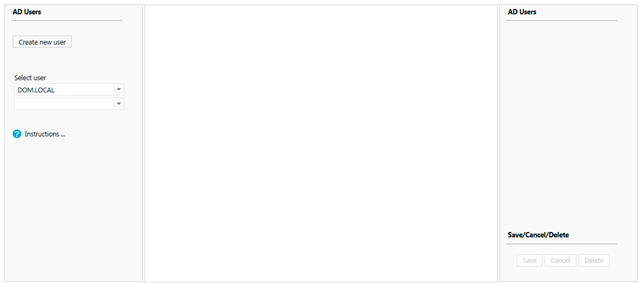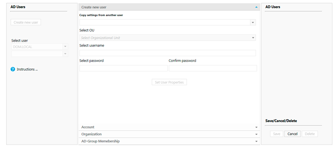 For creating a new AD user click the “Create new user” button in the left side of the interface, this will populate the middle interface as seen on figure 7. The creation can at any time during the creating be canceled by clicking cancel in the right corner.