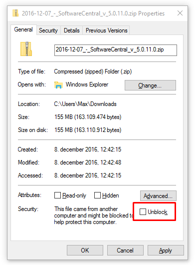 Once you have downloaded the zip file containing the update you must unblock it before unzipping it: