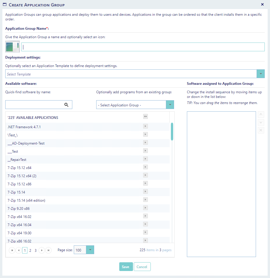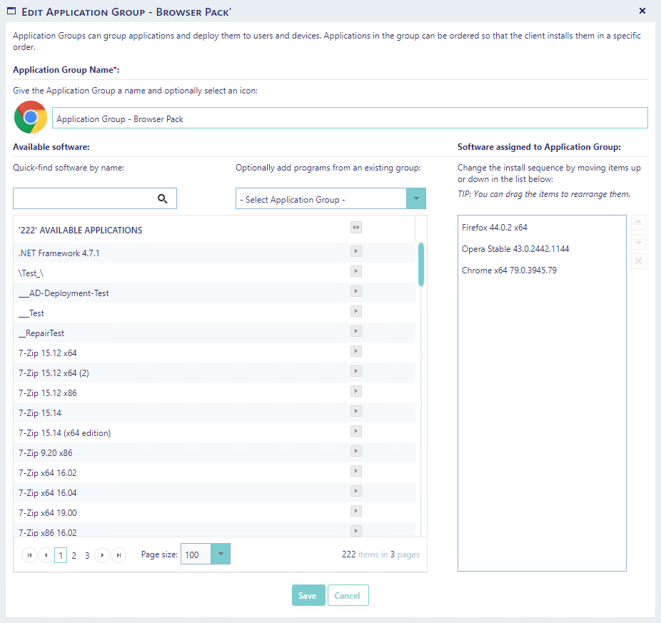 Application Groups can group applications and deploy them to users and devices. Applications in the group can be ordered so that the client installs them in a specific order.