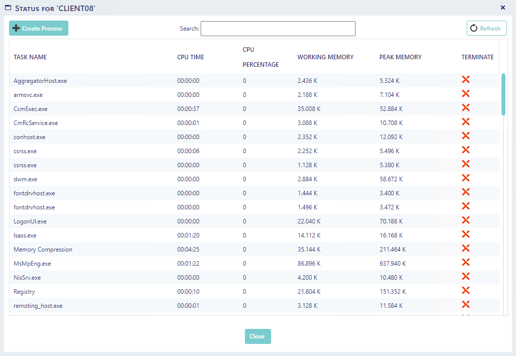 button will open the Remote Task Manager. This displays all running processes on the client computer and enables you to terminate them.