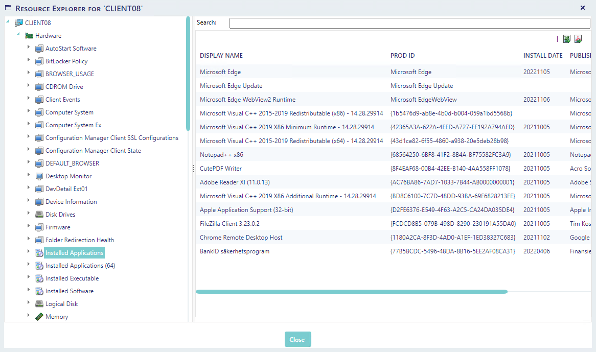 button will open a new window with a web-based version of the Resource Explorer found in the SCCM. It displays all collected client inventory data. In this interface all data in the grid can be exported to PDF or excel.