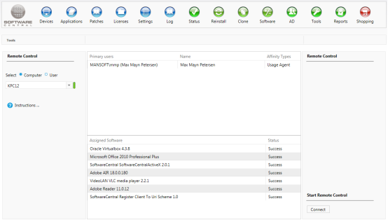 In the center of the interface, there is a list of the computers primary users and a list of software currently assigned to the computer.