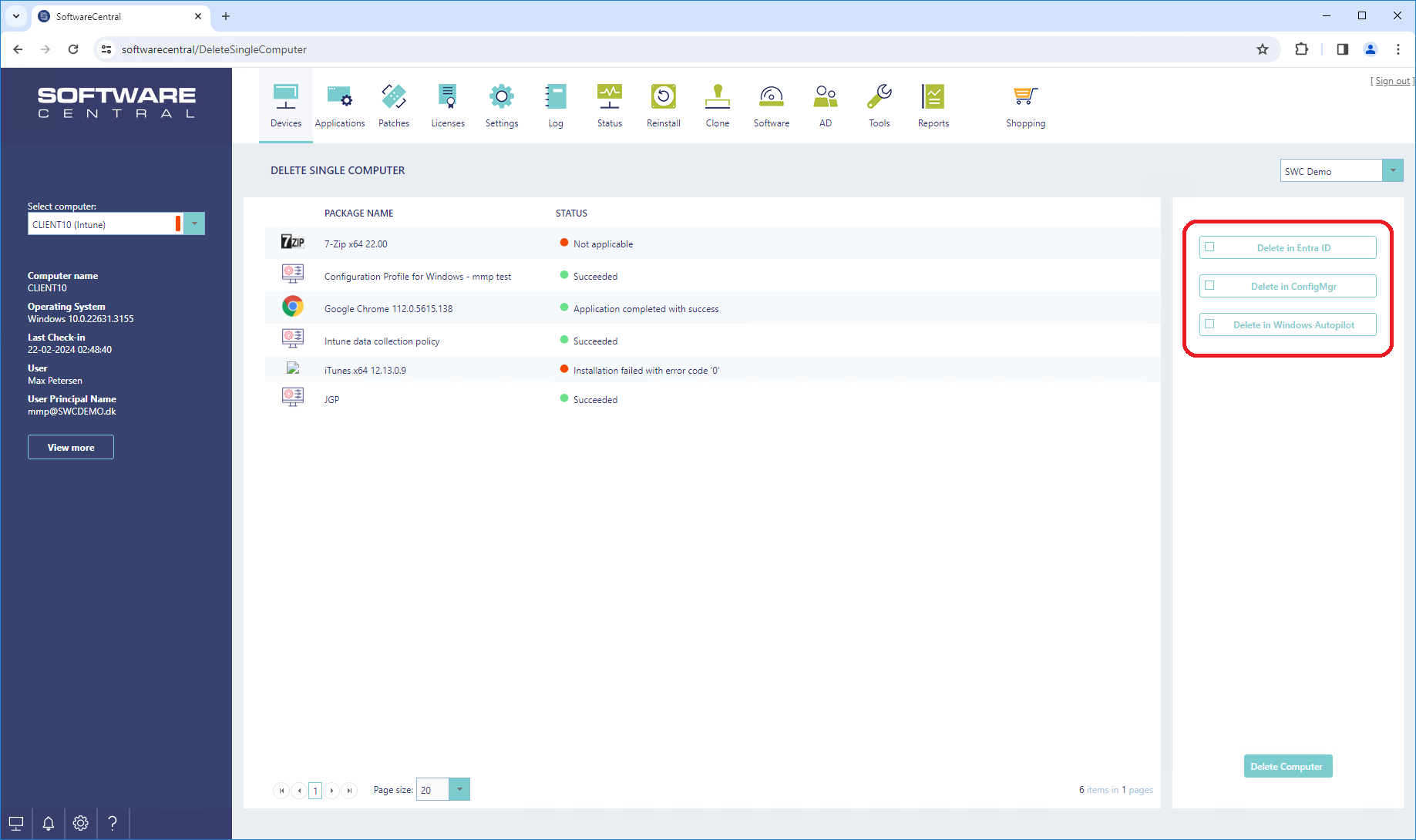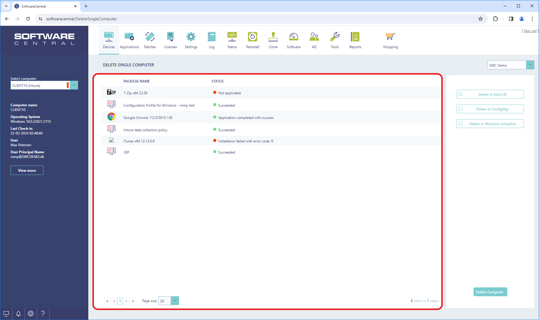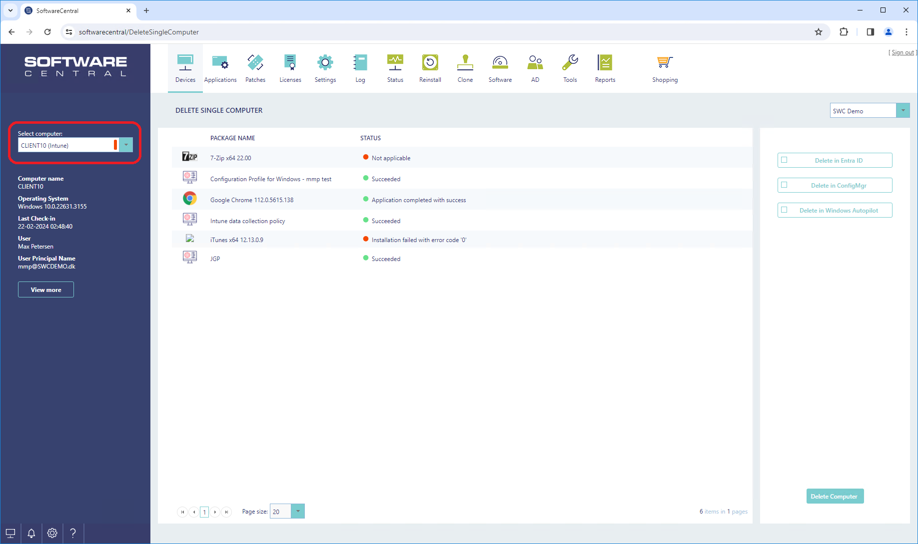 All software currently assigned to the selected computer will be displayed in the central grid: