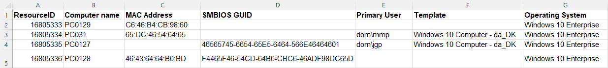 ComputerName,MacAddress,SMBIOSGUID,PrimaryUser,ComputerTemplate,OperatingSystem