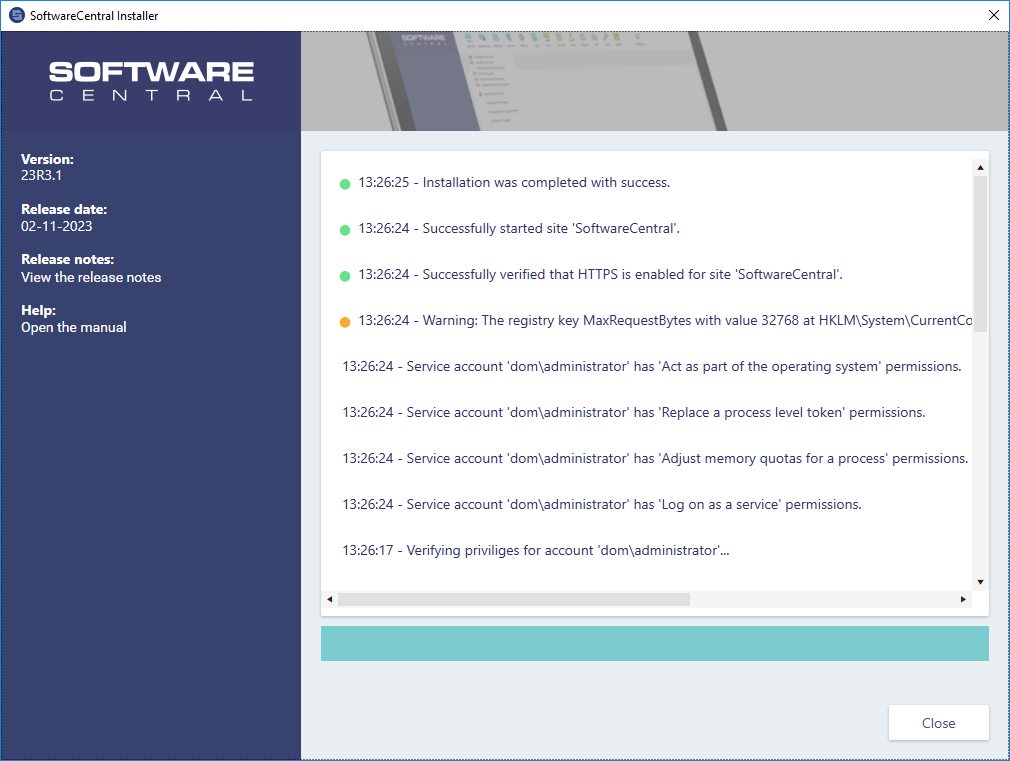 The installer must be launched with an account that have administrative permissions on the web server and full access to the SoftwareCentral database.