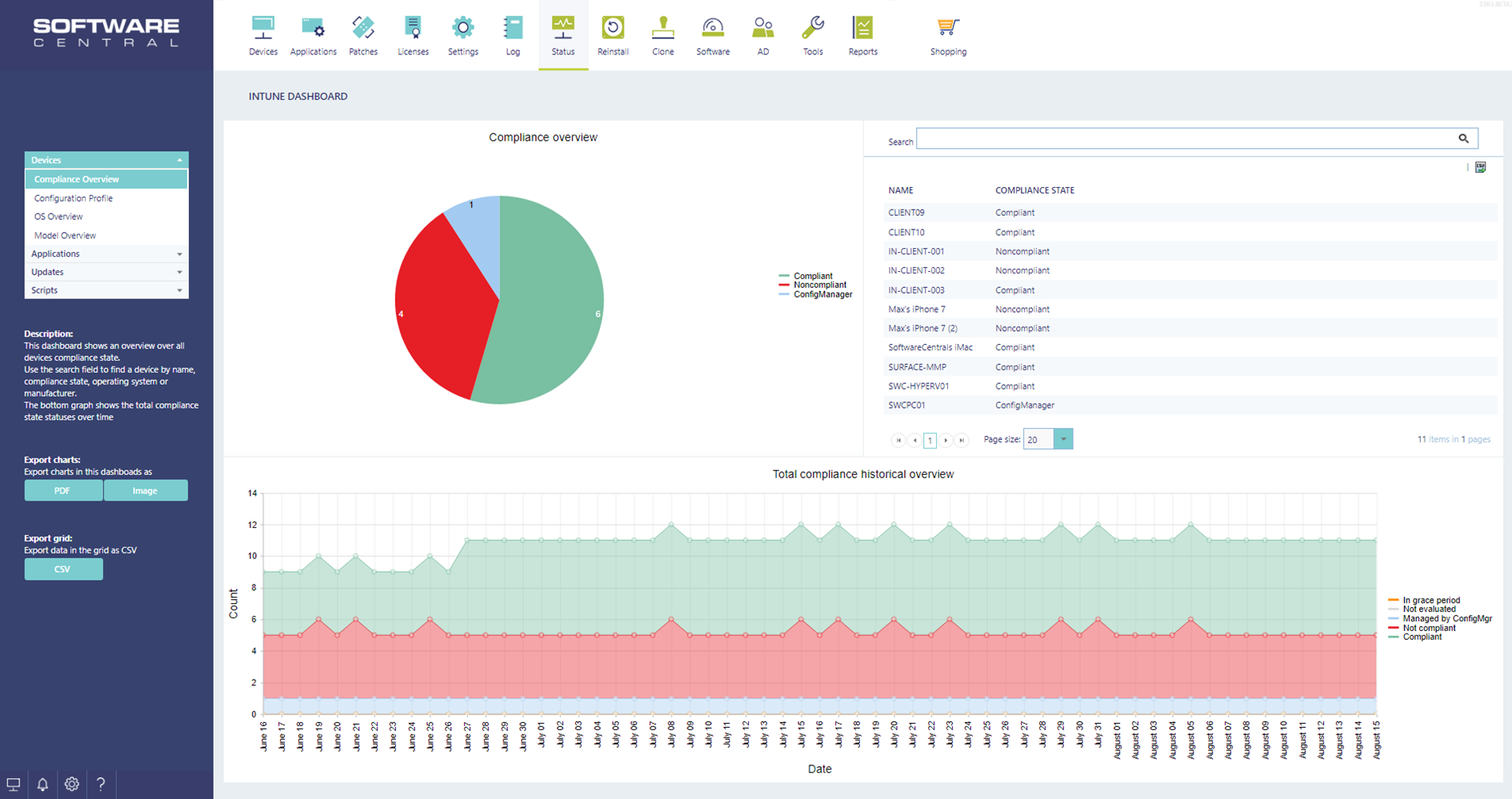 The interface is found under the Status button in SoftwareCentral and contains a range of different dashboards that show a graphical overview over different datasets from Intune.