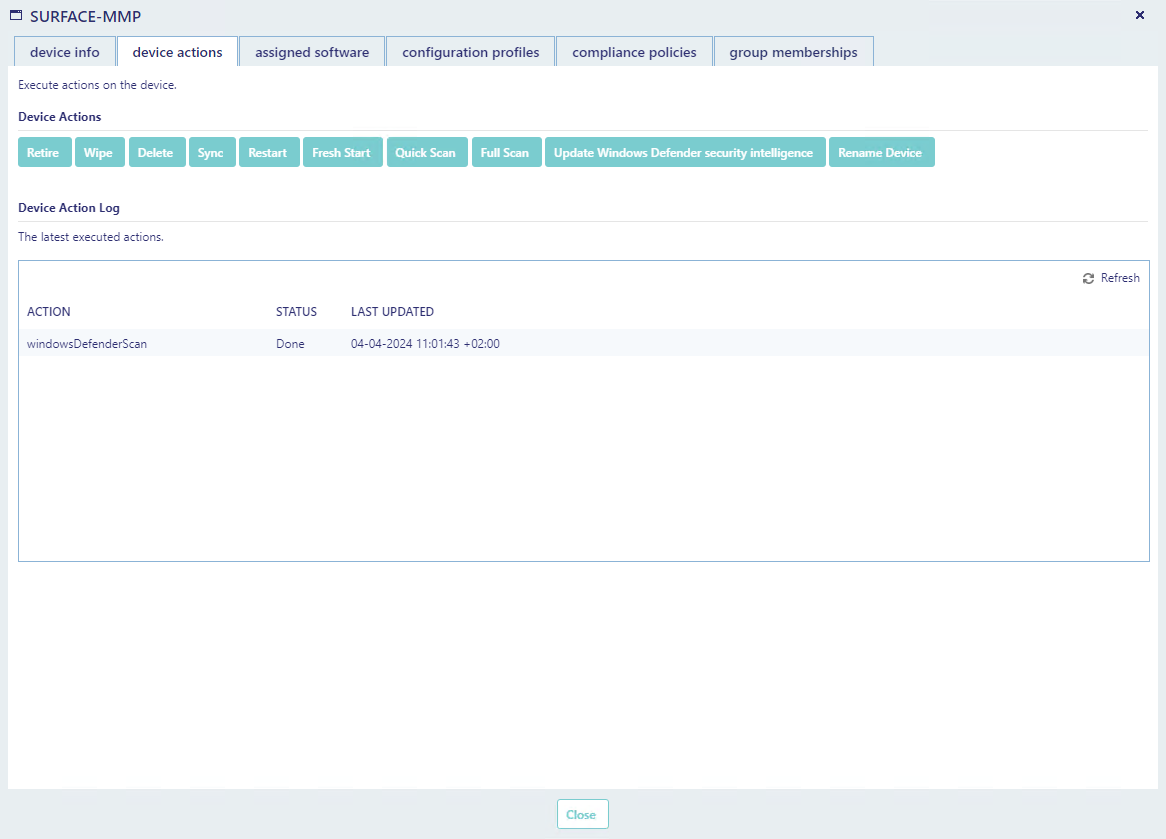 From the Device Actions tab there are multiple device actions that can be performed on the selected device. The available device actions will depend on your permissions, the device type and on the device ownership type. See a list of available actions below.