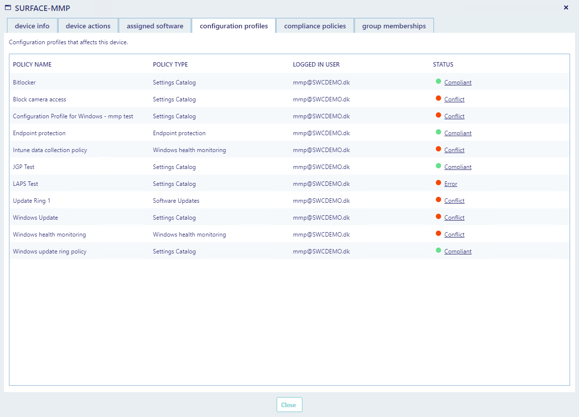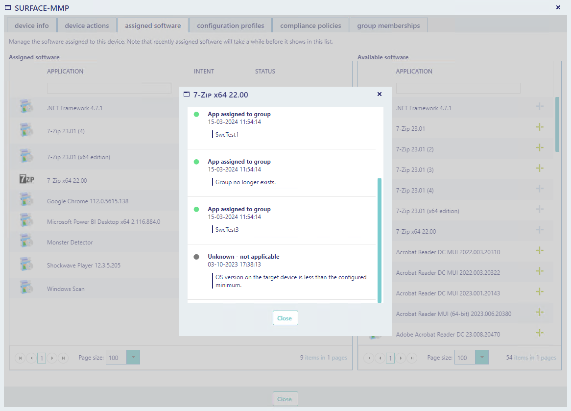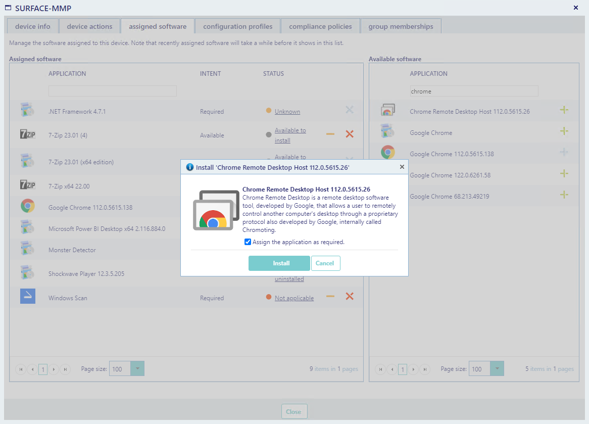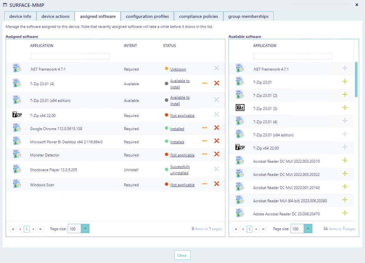 In the first grid (to the left) you can see software assigned to the device. You can see the intent (Required, available or uninstall) and the status.