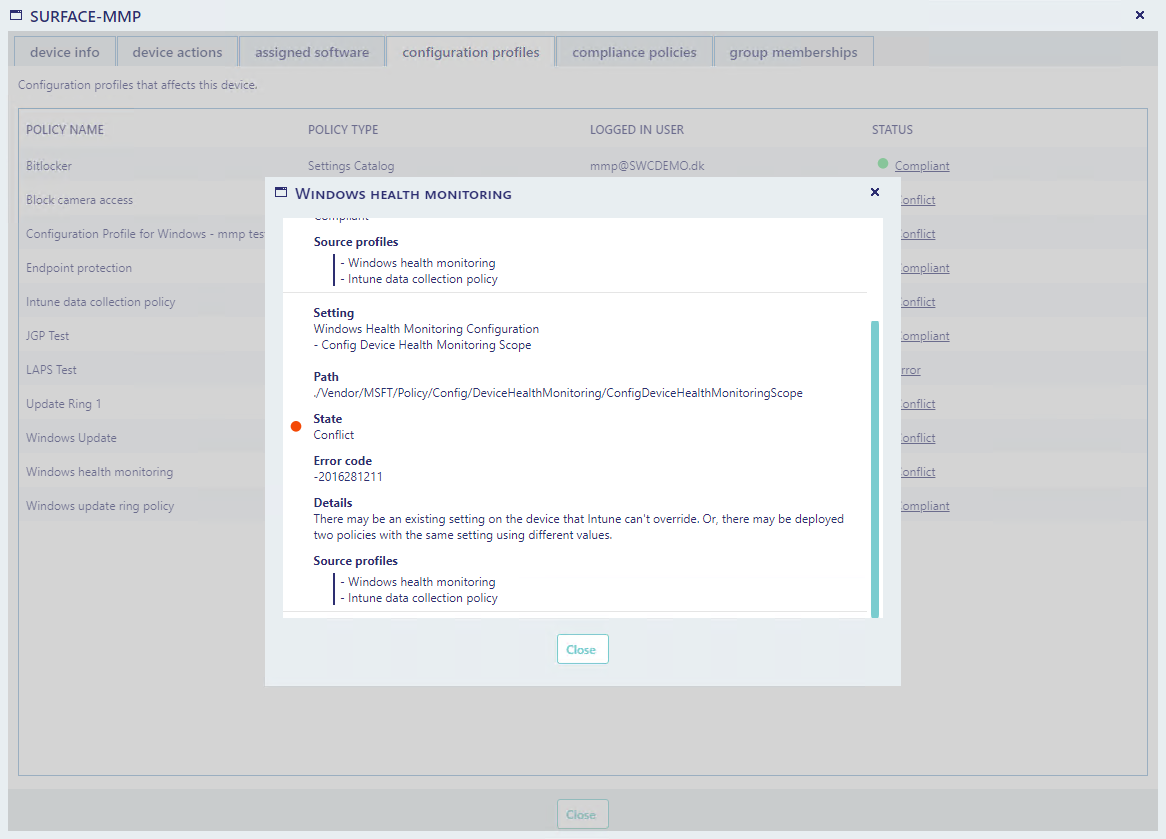 In the example below, you can see a configuration profile that has a setting that is in conflict with another configuration profile.