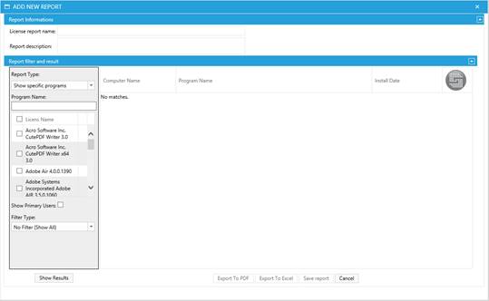 Shows license in use for specific programs, the programs will be selected in the grid, under this box. This report can be used to only show programs for specific manufactory.