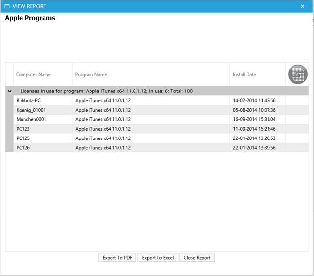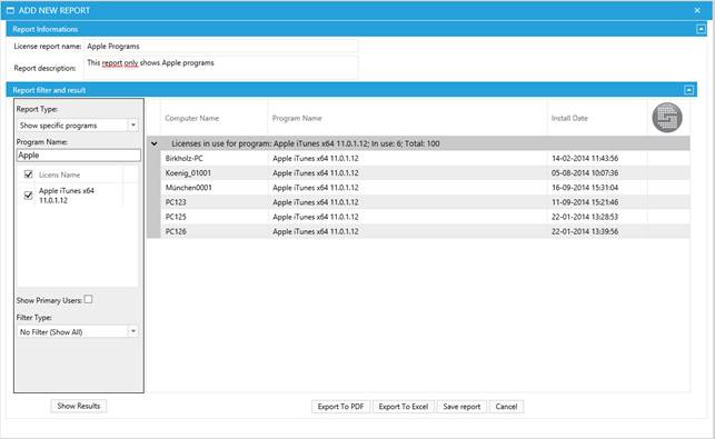 This is a SoftwareCentral standard report, showing the numbers of computers there is registered in SoftwareCentral and in SCCM. The program name must be set for a license to be showed here.
