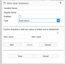 In this window the user must set, a name and a display name for the variable. If the variable should be enabled for usage, then the checkbox enabled are checked.