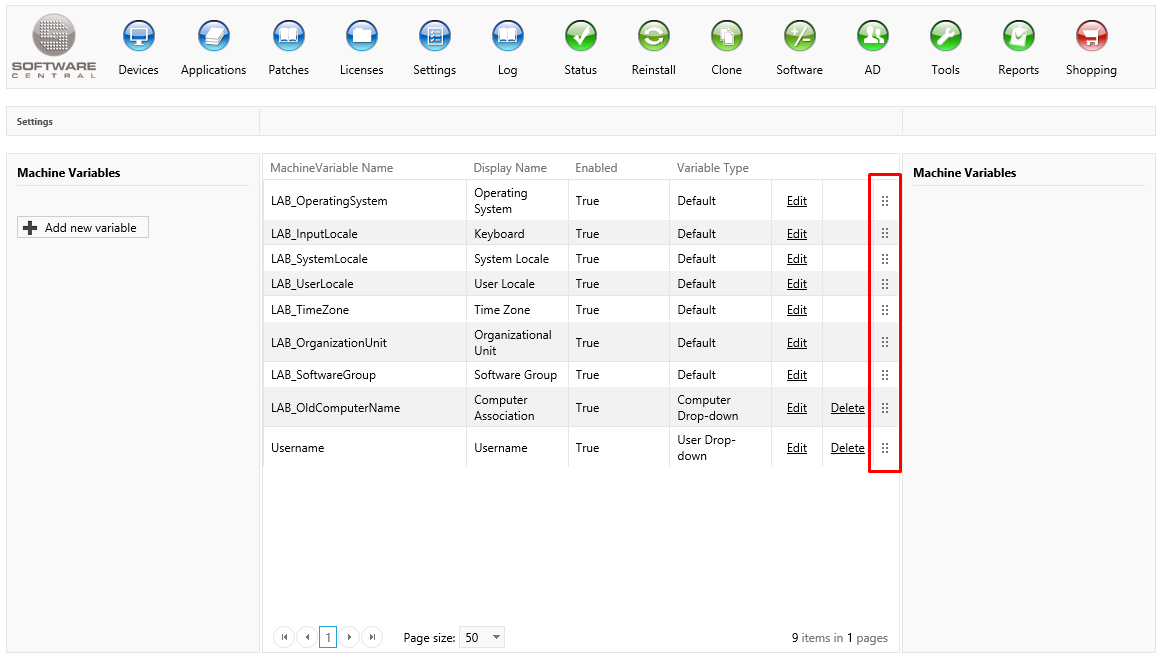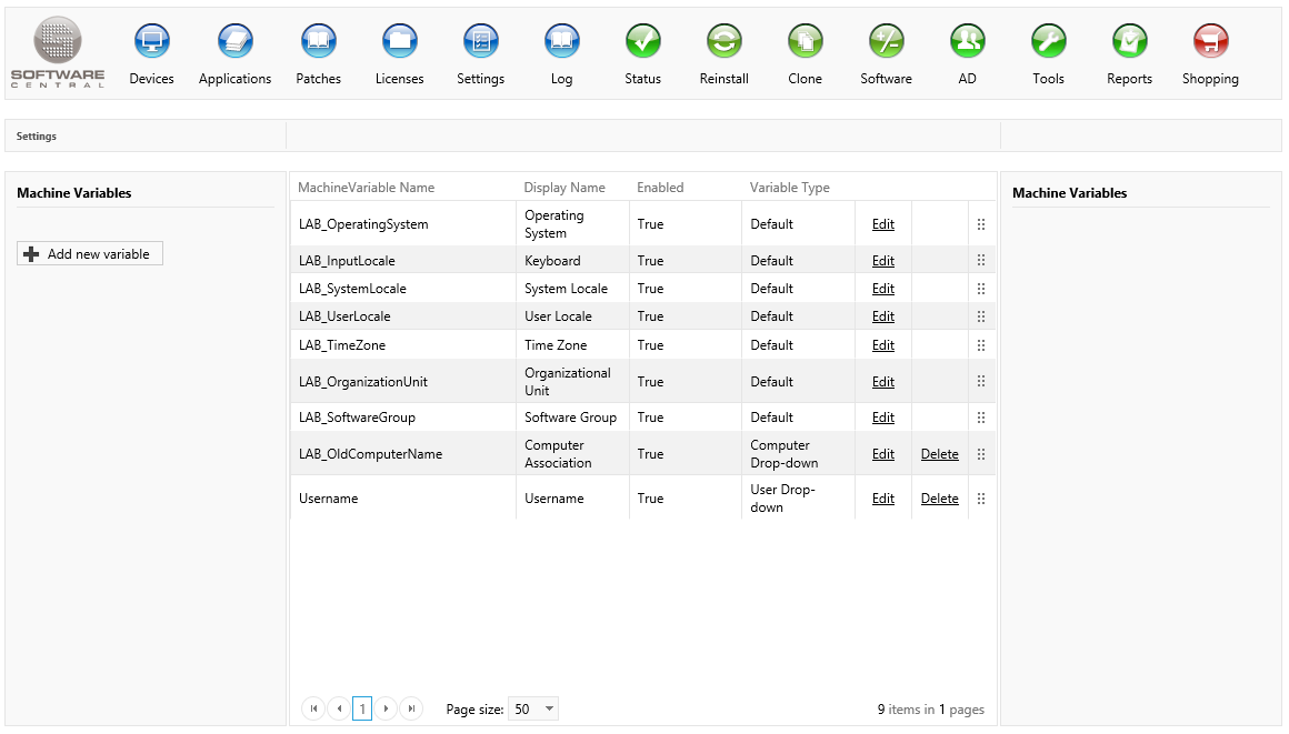 To delete a machine variable click ‘delete’ on the variable in the main interface and the variable will be deleted from Software Central