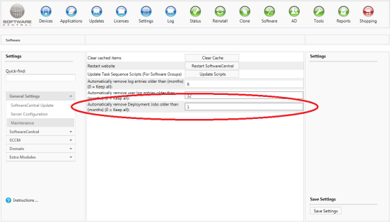 The Deployment Manager saves lots of data in the SoftwareCentral database. Over time this will cause SoftwareCentral to slow down. To avoid this SoftwareCentral can automatically remove old deployment jobs.