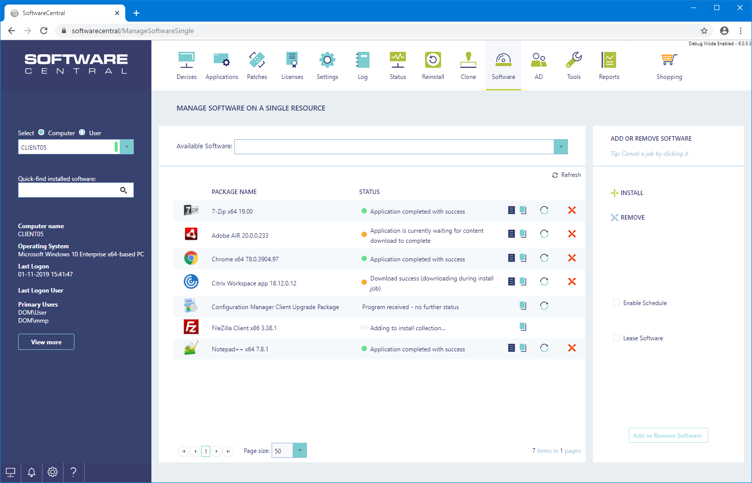 If you have searched for a specific package in the “Search assigned software” textbox in the left menu, only the status for that package is refreshed.