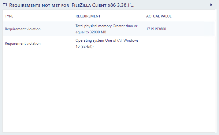 In this scenario, the requirements were not met for FileZilla Client. When we click on “Requirements Not Met”, a new window will open.