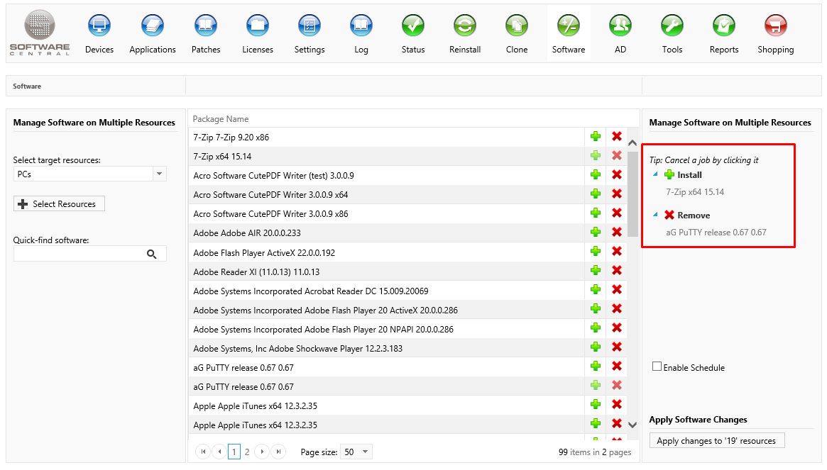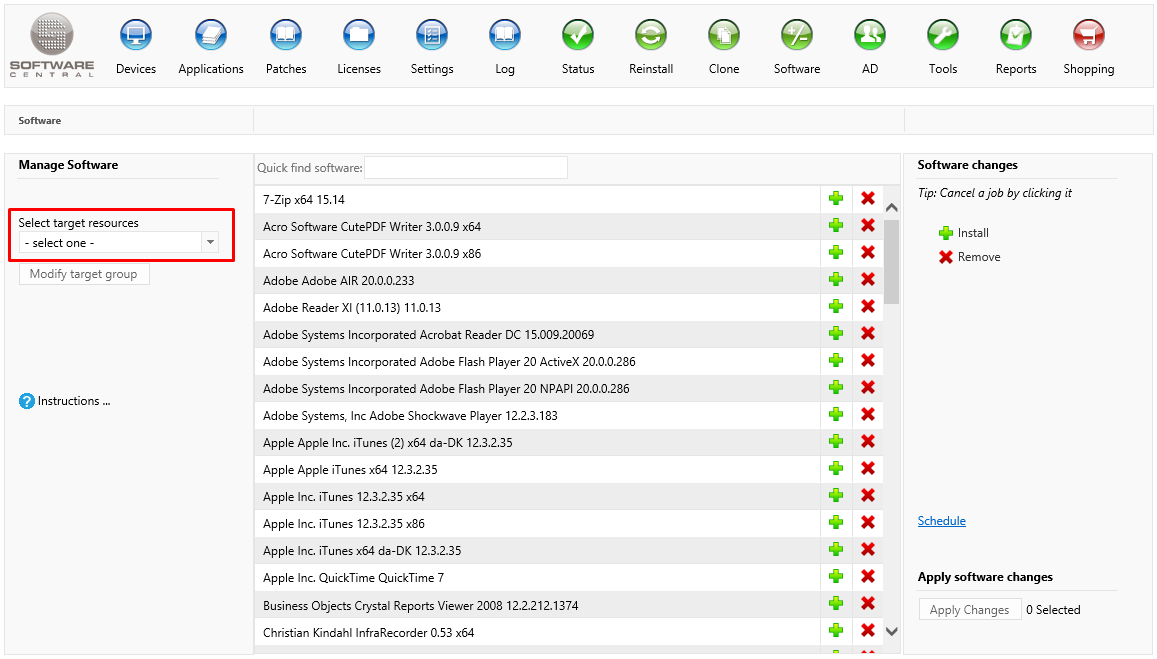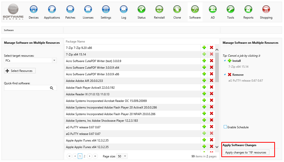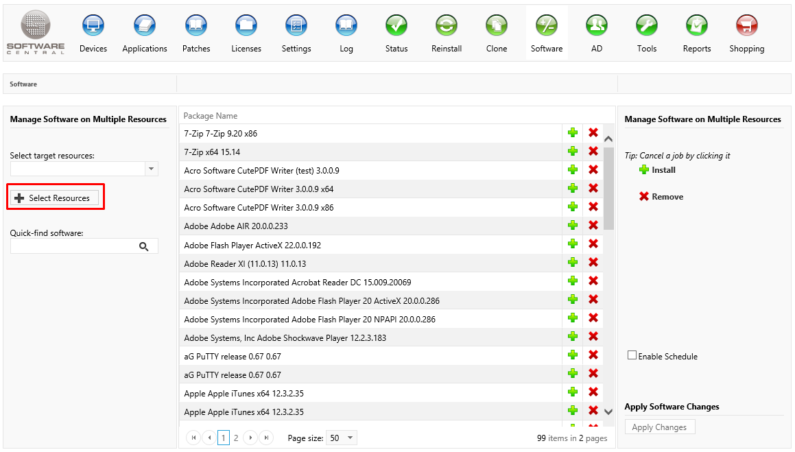 Click on the "Apply Changes" button to apply the software changes on the selected resources:
