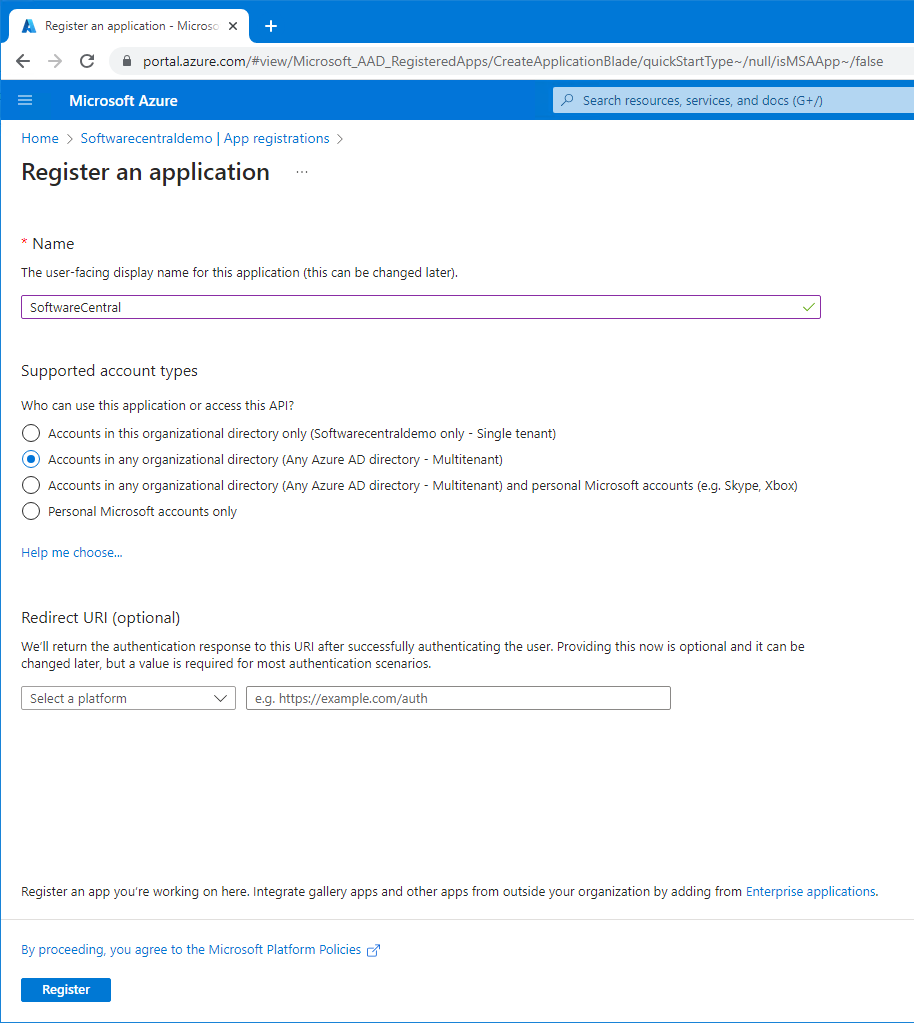 SoftwareCentral can automatically create this app registration during setup. |