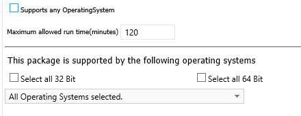 Unchecking the “Supports any OperatingSystem”and checking either the selection of all 32 bit or 64 bit Operating Systems will append an automatic x86, or x64, respectively, to the name of the package as the name is generated in various interfaces. Opening up the drop-down will present an option to Select All, which will select all Operating Systems available now and all future ones. This last option is equal to no requirements.