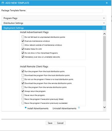 The last panel shows settings related to the deployment. It allows specification of a number of settings related to the advertisement flags of both the install and uninstall program and the install and uninstall remote client.