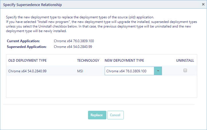 4. If both selected programs are applications, it is possible to supersede the old application with new one, if this setting is true, the following window will appear when “Replace” is pressed. This option is only available if you replace one application.