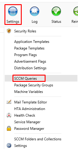 The SCCM queries interface can be accessed from the settings menu and then “SCCM Queries”: