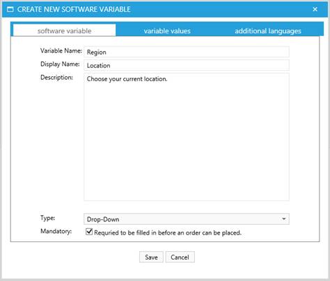 As an example, we will create a drop-down software variable named “Region”. A default display name and description has been entered.