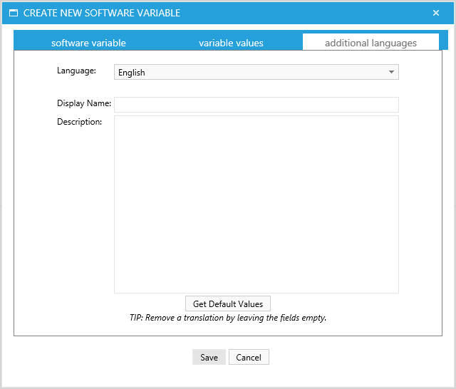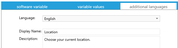 This tab enables you to translate the software variable display name and description, as entered in the first tab “Software Variable”: