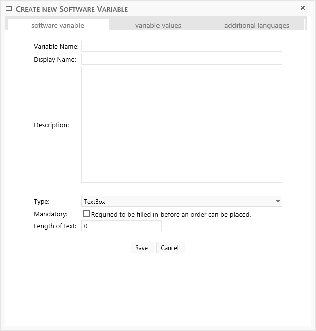 A software variable can be either a Textbox or a Drop-Down box with pre-defined values. You can define if a variable should be mandatory or not.
