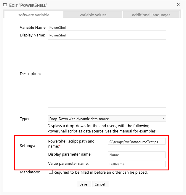 Mandatory: Defines whether or not the user must fill in the software variable before the item is ordered.