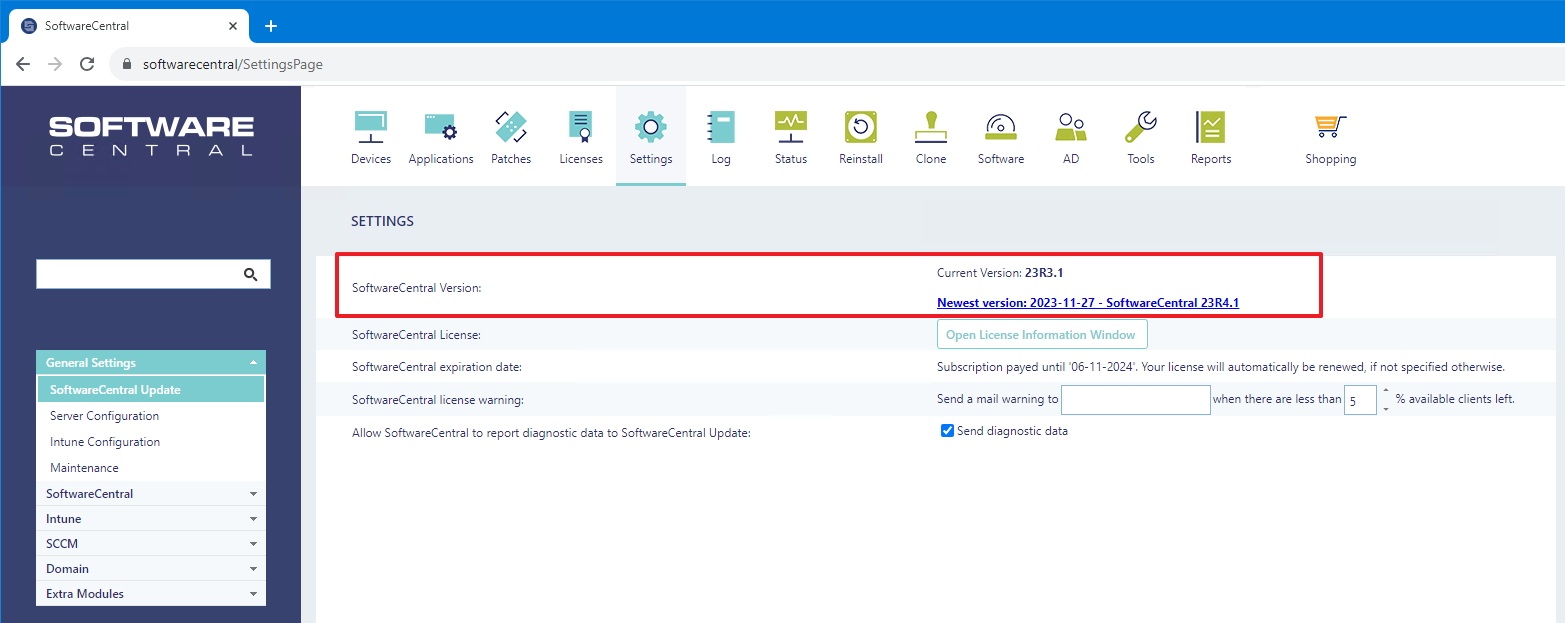 You can see if a new version of SoftwareCentral is available from the Settings menu in SoftwareCentral: