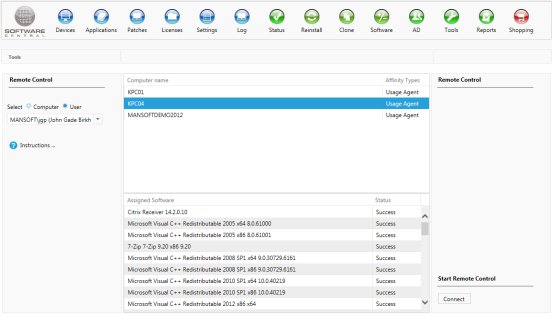 When a user is selected, the users’ primary devices will be listed in the center of the interface. Below is a list of software assigned to the user.